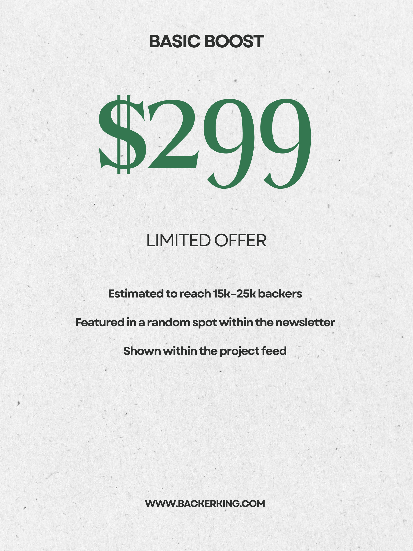 This package provides an estimated 15,000–25,000 impressions from active Kickstarter backers, giving your campaign additional visibility among users who are already engaged with the platform.